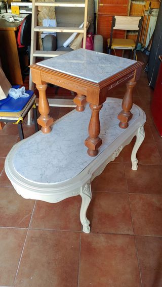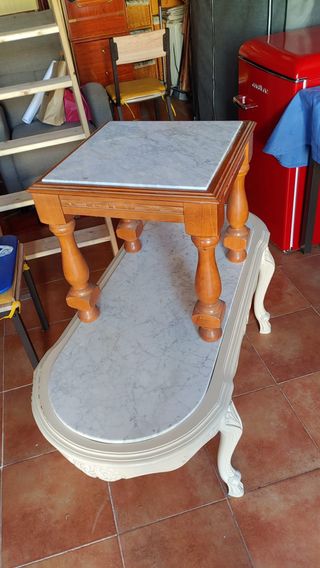 Elegante mesa de estilo vintage con una combinación de materiales que le da un toque único. - Encimera de mármol. - Base y patas de madera. - Diseño clásico y atemporal.