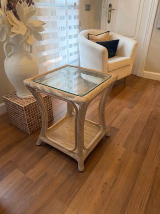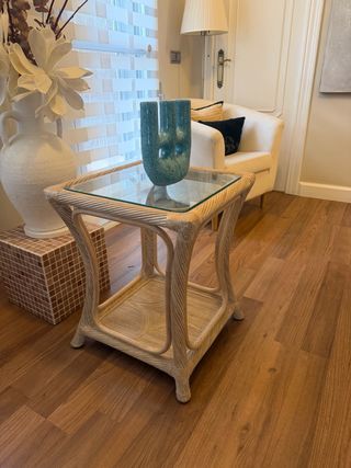 Elegante mesa auxiliar con estructura de ratán y tapa de cristal. Cuento con mas muebles de esta coleccion en mi perfil. A recoger en Banyeres de Mariola. - Diseño rústico y moderno. - Ideal para cualquier rincón del hogar.