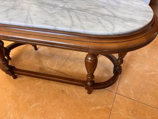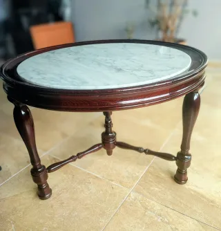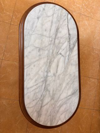 Elegante mesa de centro con un diseño ovalado. - Encimera de mármol con veteado natural. - Base y borde de madera. Tiene un metro de largo y medio metro de ancho