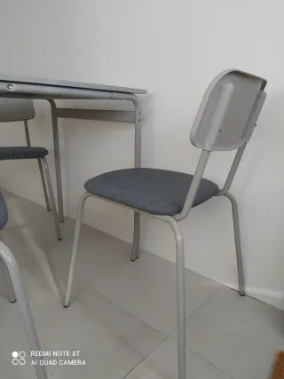 Conjunto de mesa de comedor con cuatro sillas. - Mesa de color gris. - Sillas con asiento y respaldo tapizados en gris. - Estructura metálica de las sillas.