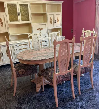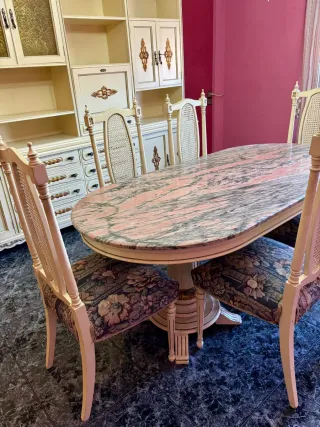 Elegante mesa ovalada de salón de madera talla maciza y marmol, vintage años 70 y 6 sillas tapizadas a juego - Encimera de mármol con vetas rosadas y beige. - Base de madera tallada maciza con detalles ornamentales dorados. - Diseño clásico que aporta un toque de distinción.
