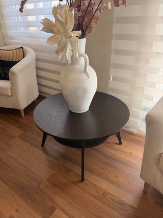 Elegante mesa auxiliar redonda con un diseño moderno y funcional. Perfecta para añadir un toque de estilo a tu salón. Recogida en Banyeres de Mariola - Acabado en madera oscura. - Diseño de dos niveles con balda inferior. - Patas cónicas estilizadas.
