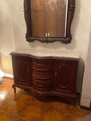 Conjunto de mesa de entrada con espejo. - Mesa con superficie de mármol. - Estructura de madera. - Diseño curvo con cajones.