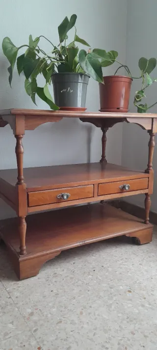 Elegante mesa auxiliar de madera maciza con un diseño antiguo. Cuenta con dos cajones y un estante inferior. - Patas torneadas. - Tiradores decorativos en los cajones. - Acabado en tono cálido.