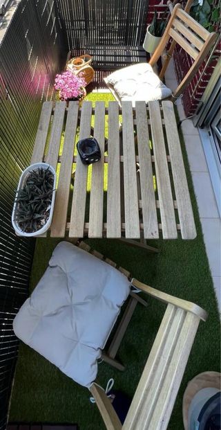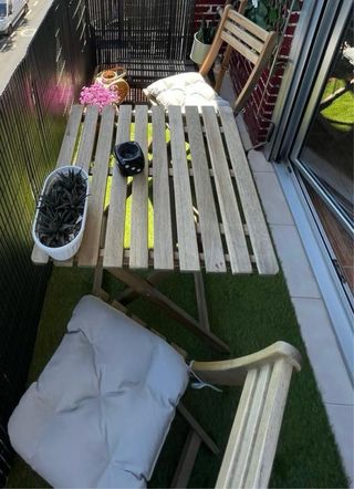 Conjunto de mesa y dos sillas plegables de Ikea. Perfectas para balcones o espacios pequeños. - Estructura de madera. - Diseño plegable para fácil almacenamiento.