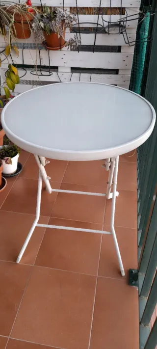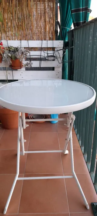 Mesa redonda de jardín con superficie de cristal y estructura de metal. Con patas plegables para fácil almacenamiento.