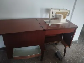Máquina de coser Singer con un diseño clásico en tonos beige. Marca Singer con su mueble. Queda como una mesa cerrado y luego se despliega para trabajar. Funciones: Puntada recta, zigzag y sobre hilado. Marcha atrás y para hacer ojales y coser botones. Es Eléctrica con pedal eléctrico incorporado. Funciona perfectamente.