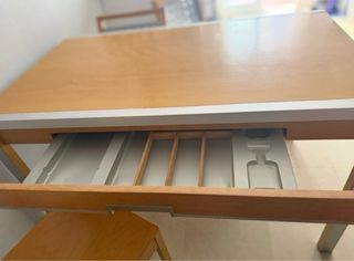 Mesa de cocina con diseño extensible. Ideal para optimizar el espacio.Medidas 1,20 de larga y abierta 1,90 por 76 de altura y 80 de ancha se pueden desmontar las patas más mesas y cosas en mi perfil dispongo de furgoneta dispongo de furgoneta - Cuenta con dos cajones. - Patas de madera torneada.