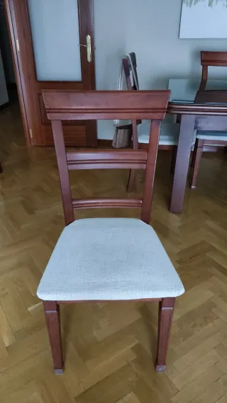 Conjunto de mesa y seis sillas. Ideal para dar un toque elegante a tu salón. Mesa de salón extensible . Medidas : cerrada 140cm. Abierta 250cm Madera maciza. Cristal sobre tablero. Sillas tapizadas ,faltaría meter la esponja del asiento.La tela está nueva