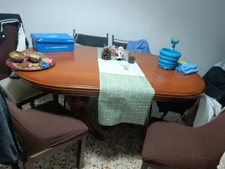 Mesa de comedor de madera oscura, ideal para reuniones familiares o de amigos. Su diseño clásico se adapta a cualquier estilo de decoración. - Patas robustas para mayor estabilidad. - Superficie amplia para colocar platos y centros de mesa. Incluyen 6 sillas forradas con fundas de quita y pon. Regalo mesa baja centro sofá haciendo juego Recoger en Aranjuez Ocasion Urge