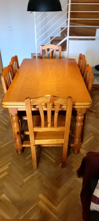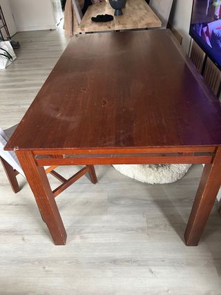Mesa de comedor de madera, ideal para reuniones familiares o con amigos. Su diseño permite extenderla para acomodar a más comensales. Solo para RECOGER no hago envios - Capacidad para 6 personas. - Extensible hasta 8 personas. - Patas robustas y decorativas.