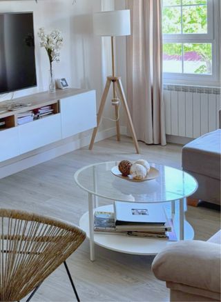 Mesa de centro redonda con cristal,es muy bonita tiene un mes de comprada porque me he mudado y no me cabe es el motivo de la venta