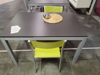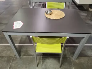 Conjunto de mesa de comedor con cuatro sillas. - Diseño moderno con detalles en verde lima. - Patas de mesa oscuras. - La mesa se extiende por ambos extremos. Dispone de patas con ruedas para facilitar la extensión. Dimensiones de la mesa: 140cm x 90cm Dimensiones de la mesa extendida por un extremo: 180cm x 90cm Dimensiones de la mesa extendida por ambos extremos: 220cm x 90cm La mesa se entrega desmontada. Durante el desmontaje, uno de los cristales de la mesa se ha desprendido y se ha roto.