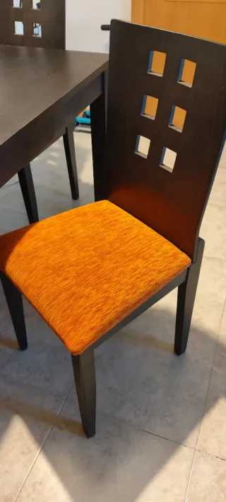 Conjunto de mesa extensible para el salón junto con cuatro sillas a juego. La mesa tiene un diseño moderno y las sillas cuentan con un tapizado naranja vibrante. Extensión hasta 2 metros x 90 de ancho. Madera sin pulir tipo rustico. No se ha usado más que para el ordenador 😬 - Mesa extensible. - Tapizado naranja en las sillas. - Diseño moderno.