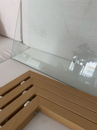Elegante mesa de cristal y patas de metal efecto madera. Hay que pegar las patas al cristal. De ahí su precio. - Diseño moderno y minimalista. - Combina cristal transparente con estructura de metal efecto madera en tono marrón.