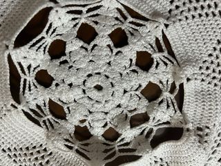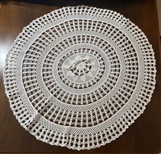 Tapete artesanal de crochet, perfecto para decorar tu mesa camilla. Su diseño circular y calado le da un toque elegante. - Tejido a mano con hilo de algodón. - Color blanco. - Diámetro de 80 cm.