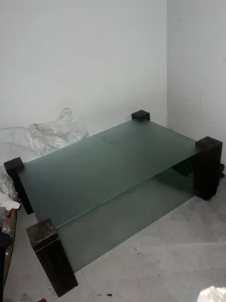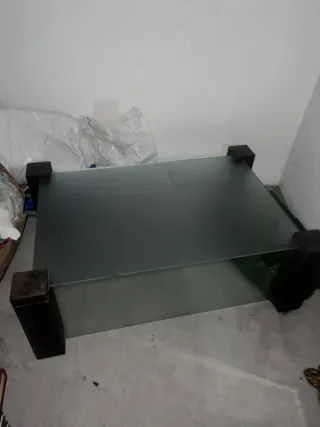 Se vende mesa de cristal y espejo. Patas y barrotes negro con perlado,aunque en la foto parece que la pintura negra esta saltada no está. Es un negro perlado, en la foto de la pata se aprecia mejor. La parte de arriba tiene cristal de 1m x 1 m y la de abajo es espejo