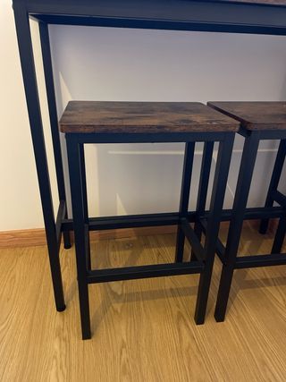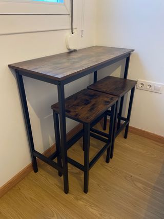Conjunto de mesa alta con dos taburetes a juego. Ideal para espacios reducidos o como zona de desayuno. - Diseño moderno con sobre de madera y estructura metálica negra. - Los taburetes se pueden guardar debajo de la mesa. Mesa: 100x40x90 Taburetes: 40x30x65