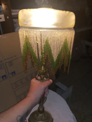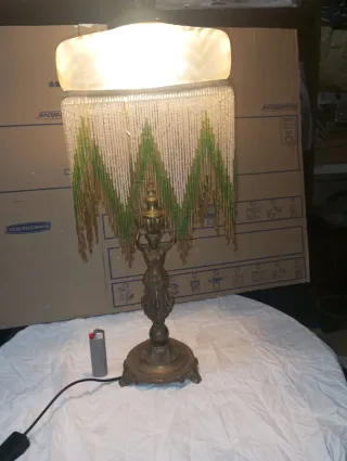 Elegante lámpara de mesa con un diseño clásico y detalles ornamentales. Es antigua. - Base y estructura de metal con acabado dorado. - Pantalla con flecos de cuentas en tonos verdes y dorados. - Figura decorativa en la base.