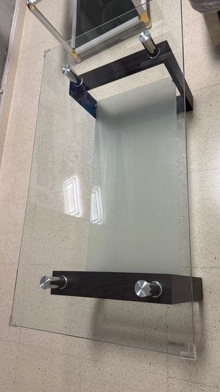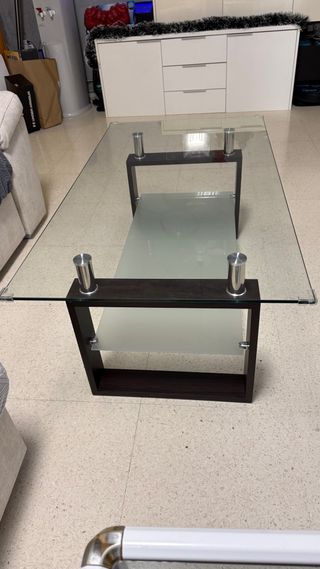 Elegante mesa de centro con superficie de cristal y estructura de madera oscura. Cuenta con un estante inferior para mayor espacio. - Diseño moderno y funcional. - Combinación de materiales de calidad. se ha usado 1 mes