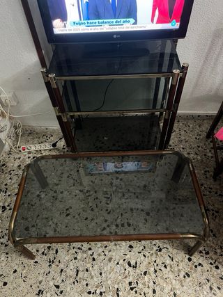 Conjunto de mesa de centro y mueble para televisión. - Mesa de centro con soporte de cristal y estructura de metal y madera (105 x 55 x 38) - Mueble de televisión con baldas de cristal y estructura de metal, madera y ruedas (82 x 47 x 82)