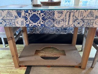 Mesa de catering de madera, ideal para todo tipo de celebraciones (comuniones, bodas, bautizos, despedidas de soltero, etc.) y su uso tanto en interior como en exterior. Consta de una estructura blanca compacta, sencilla y duradera, a la cual se le pueden añadir diferentes detalles atendiendo al tipo de eventos a celebrar. Además cuenta con luces totalmente funcionales en el techo, las cuales funcionan con un interruptor y su precio enchufe a la corriente. Únicamente se ha utilizado una vez para una comunión y el resto del tiempo ha estado guardada en casa, nos queremos desprender de ella debido a que ocupa un espacio utilizable.