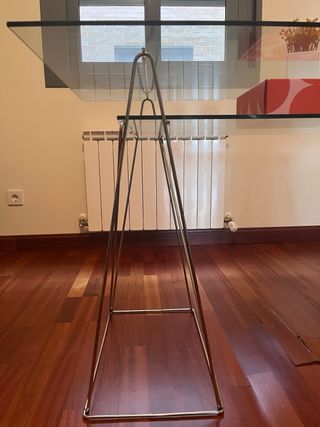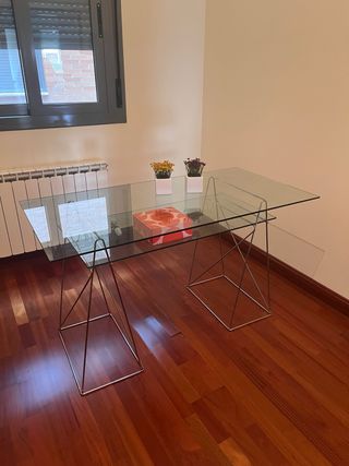 Mesa de Kare Design con sobre de cristal y estructura metálica. - Diseño moderno y minimalista. - Patas metálicas en forma de pirámide. - Superficie de cristal transparente. Tiene una pequeña raya en el centro de la mesa que se ve en la foto. Ese es el único fallo.