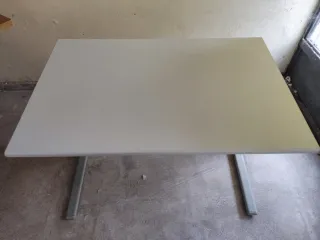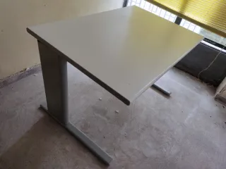 Mesa de escritorio en perfecto estado. Blanca. En perfecto estado. 90cm largo, 60cm fondo y 75cm alto . Tablero de fibra, pintura acrílica, patas de acero y pie de plástico .