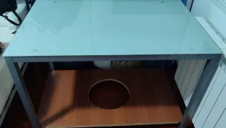 Mesa con superficie de cristal y estructura de metal, que incluye una tarima de madera. - Diseño moderno y funcional. - Combina materiales como cristal, metal y madera. Medidas: 110cm largo 70cm ancho 75cm alto