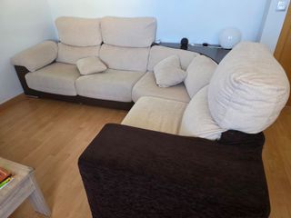 Vendo sofá rinconera de gran tamaño en combinación de colores beige y chocolate. Es un sofá de diseño moderno, muy amplio y perfecto para salones grandes. Dimensiones: 2,80 m de largo x 2,25 m de ancho. Gran confort: Asientos profundos (1 metro) y muy cómodos. Módulo de rincón único: Incorpora una superficie rígida en el rincón con cristal en la parte superior que funciona como mesa auxiliar (ideal para lámparas o mandos). Diseño: Patas cromadas que facilitan la limpieza y dan un aire ligero. El sofá está bien cuidado y la estructura está perfecta. Importante: El material sintético (polipiel/ski) del brazo marrón se ha desgastado