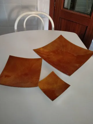 Conjunto de tres centros de mesa decorativos con un diseño radial.Los tres platos por 12 euros Nuevos, han estado siempre guardados. - Pieza grande 29x29cm - Pieza mediana 20x20cm - Pieza pequeña 12x12cm. Mira mi perfil tengo un montón de cosas interesantes