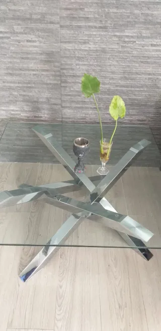 Elegante mesa con superficie de cristal y una base metálica con un diseño moderno. - Diseño de base en forma de X. - Acabado brillante.