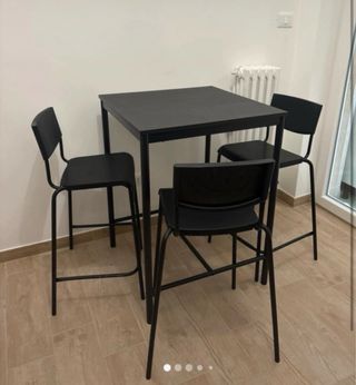 Conjunto de mesa alta y dos taburetes. - Diseño moderno y funcional. - Patas metálicas resistentes.