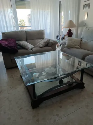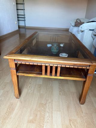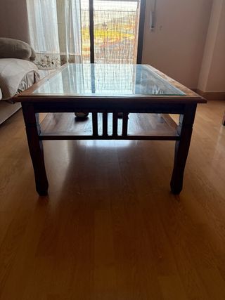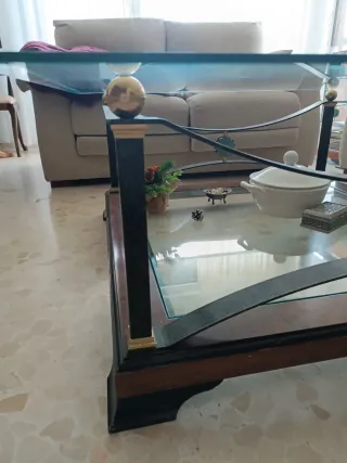 Mesa de centro baja para salón, robusto, con gran calidad y diseño clásico y elegante. - Doble cristal, el superior biselado. - Base de madera nogal y hierro forjado con estampado. - En buen estado, con marcas leves del tiempo. Es un mueble que nuevo costaría mucho más por los materiales y la calidad de fabricación.