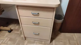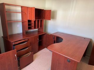 Conjunto de mobiliario de oficina que incluye una mesa y dos armarios, estantería y cajonera-archivador. Todo en muy buen estado. Marca Actiu - Mesa de oficina con diseño curvo. - Un armario con cajones y archivador. - Otro armario con puertas y compartimentos. - Una estantería Se vende todo junto