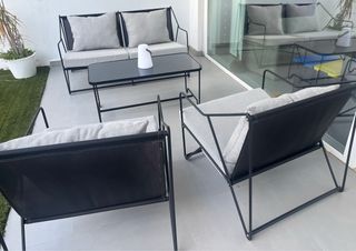 Conjunto de mesa y sillas para exterior. - Estructura metálica. - Asientos y respaldo de tejido. - Adquiridos hace 8 meses, muy bien estado. - Se vende por traslado a otro domicilio.