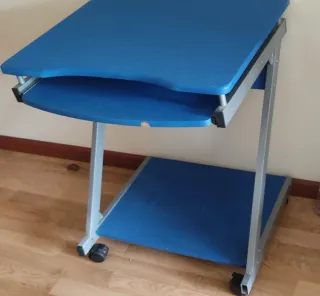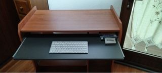 Escritorio con un diseño moderno y funcional, ideal para tu espacio de trabajo o estudio. Su superficie principal es amplia y cuenta con un práctico soporte adicional para colocar monitor. Está en buen estado. Tiene un pequeño desperfecto en mesita de monitor por un tornillo que ha sobresalido.