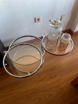 Elegante mesa auxiliar con estructura de acero y superficie de cristal. - Diseño moderno y funcional. - Acabado plateado brillante. - Tableros redondos de cristal transparente.