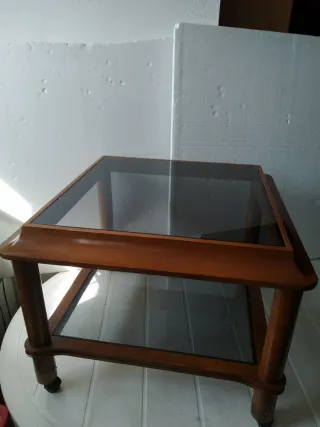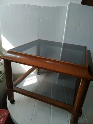 Elegante mesa auxiliar con estructura de madera y superficie de cristal.9 - Diseño moderno y funcional. - Patas con ruedas para fácil movilidad. - 60x60 , alto 47