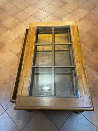Mesa de centro con superficie de cristal y estructura de madera maciza. - Medidas: 100x100x50 cm. - Cuenta con tres cajones dobles para almacenamiento.