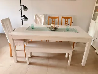 Conjunto de mesa con superficie de cristal y cuatro sillas de color blanco. El conjunto está a estrenar. - Mesa con patas de metal. - Sillas con asiento y respaldo acolchados.