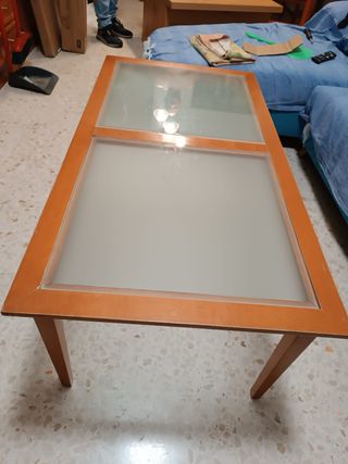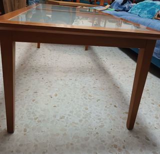 Elegante mesa de madera de cerezo con una superficie de cristal. - Estructura de madera natural. - Tapa de cristal transparente. Precio negociable