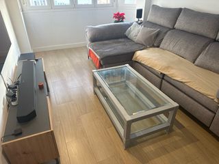 Mesa de centro con un diseño moderno y elegante. Presenta marcas de uso - Acabado en tonos beige y marrón. - Falsa madera. Tiene marcas de uso. Tiene desperfectos. Si alguien la quiere, puede venir a recogerla.