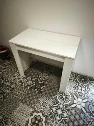 Mesa de madera de color blanco, ideal para cocina o como escritorio 90X50 Más dos extensibles de 20 cm cada una en los laterales - Diseño sencillo y funcional. - Patas robustas para mayor estabilidad.