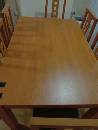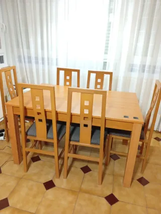 Conjunto de mesa de comedor con seis sillas a juego, mesa centro y mesa auxiliar, color cerezo. Se puede vender por separado, preguntar. RECOGER EN DOMICILIO. - Mesa de madera extensible de color cerezo. - Seis sillas de madera con asientos tapizados. - Mesa centro y mesa auxiliar - Diseño moderno y funcional.