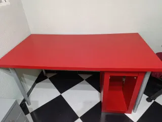 Mesa de escritorio con un diseño moderno y funcional. - Superficie de madera. - Patas de metal. - Compartimento de almacenamiento integrado.