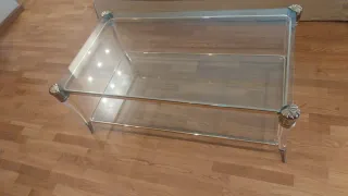 Elegante mesa de centro con superficie de cristal y estructura metálica dorada de latón de alta calidad. Su diseño combina a la perfección con cualquier estilo de decoración. Opción de tener a juego un mueble tipo consola. (Las dos juntas 90€) Esta el Barcelona (Sants) - Patas de metacrilato y metal. - Doble superficie de cristal.
