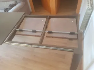 Elegante mesa de comedor de Madera con cristal blanco en el Centro. Ahora mismo está desmontada en el trastero, por eso no tengo más fotos. Es una mesa robusta, costó en 2010 800 eur. No recuerdo si mide 120 o 180 y es extensible. Es de muy buena calidad pero no la vamos a usar más.