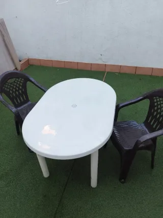 Conjunto de mesa y dos sillas de plástico para exterior. - Mesa ovalada blanca. - Sillas marrones con diseño de rejilla.