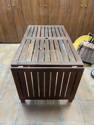 Mesa de madera para exterior, con un diseño práctico y funcional. Medidas en la última foto - Estructura robusta de madera. - Diseño extensible para adaptarse a tus necesidades. - Acabado en tono marrón oscuro.